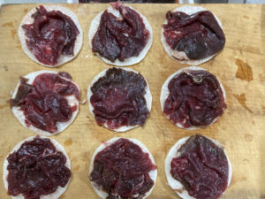 2. 大根に肉を挟みます。肉がはみ出しても足りなくても問題ありません。