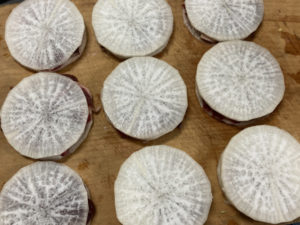 1. 大根は良く洗って2mm程度の厚さの薄い輪切りにする。(薄切りなので皮付きのままで大丈夫ですが、気になる場合は皮をむく。)
