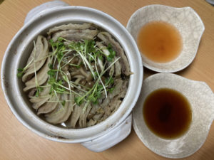 5. 鍋を食卓に置いて器に取りながら熱々をお好みのたれをつけて食べます。